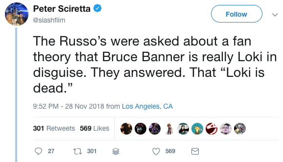 ▼記者Peter Sciretta透過推特發文轉播了兩位導演現場回答的問題。有人問「回到地球的布魯斯·班納博士有沒有可能是洛基假扮的」,羅素兄弟直接回答:「他已經不在了。」