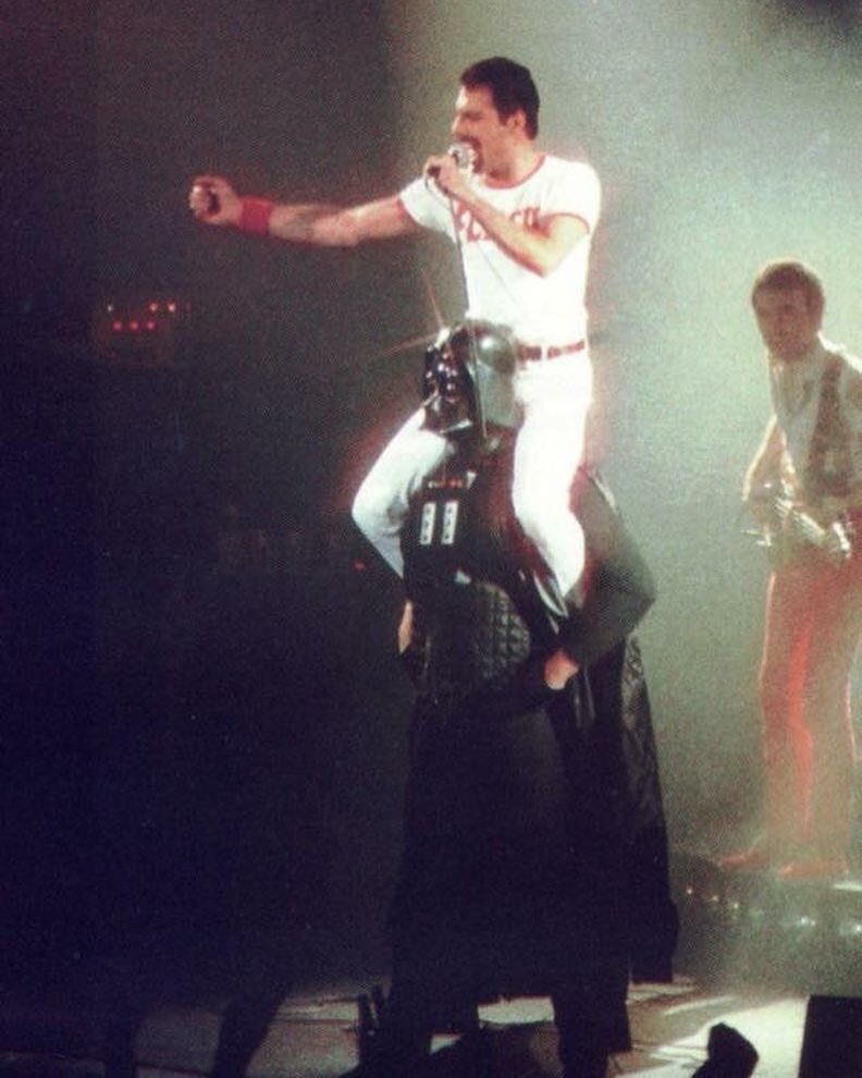 ▼佛萊迪墨裘瑞騎在《星際大戰》中達斯維達的身上。