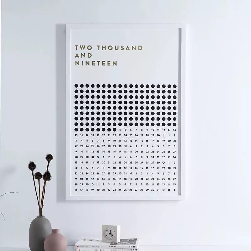 ▼《時間消逝日曆》: 由「elekoo公司」研發設計。據介紹,設計者是為了讓大家能夠珍惜,在日常生活中不知不覺就流逝了的每一天,才設計出這款日曆。外觀主要以純白為基礎色調,像極了一幅簡約的掛畫。 每當過完一天,就可以用工具吸走數字,露出黑色的圓點。當被黑色佔據版面時,也就代表了一段時間的結束。