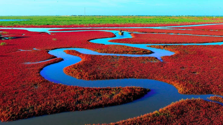 ▼中國遼寧,8萬公頃、無邊無際的臨海濕地「盤錦江紅沙灘」(Red Beach)。