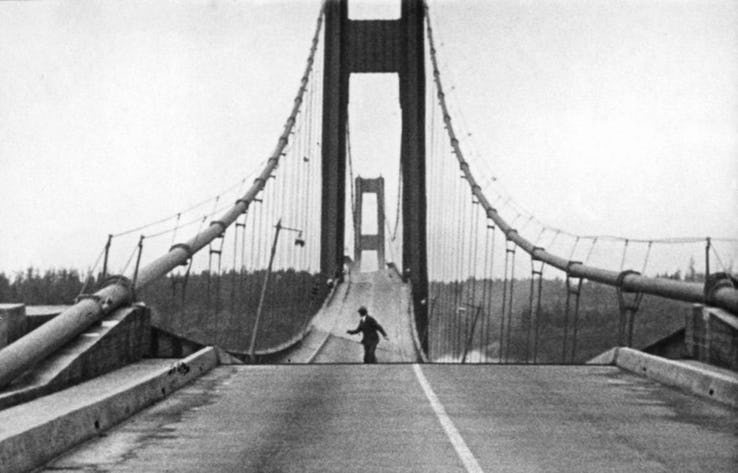 如果你有看過一座「會跳舞」的橋,這就是那座受強風吹襲會引起卡門渦街效應,使橋身擺動的橋。當初的建築師沒有想到卡門渦街的振動頻率和吊橋自身的固有頻率相同時,會引起吊橋劇烈共振。崩塌之後,也成為了建築學的活教材。