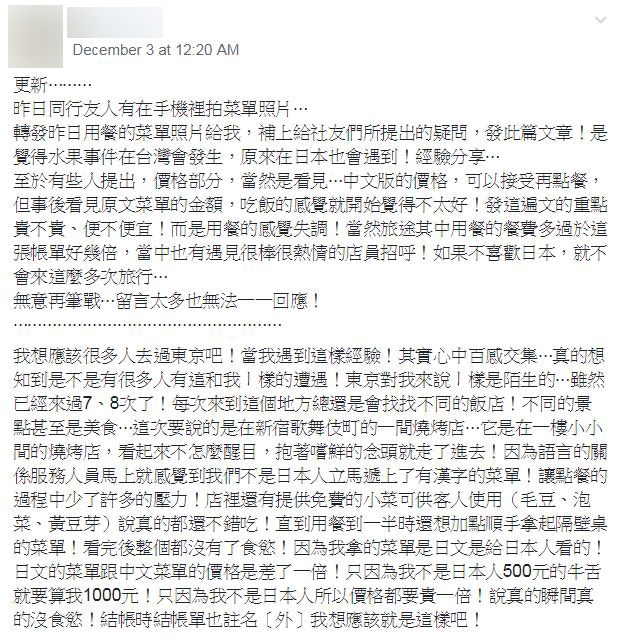 2018年12月17日出國旅遊時,如果發現有不肖商人故意哄抬價格來欺騙自己,一定會影響到旅途上的美好心情。如今就有網友在臉書社團《爆料公社》上po文表示,他到日本東京新宿歌舞伎町某家燒烤店用餐時,無意中發現了店家的中文版與日文版的菜單竟然有不一樣的價錢,而中文版的價格硬生生貴了一倍!