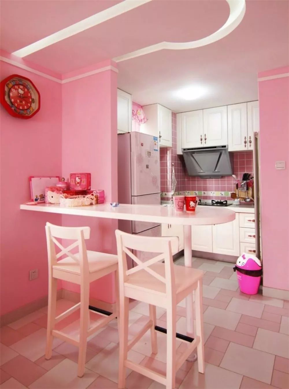 ▼廚房的牆壁採用了粉紅色的方形磚,木櫃則是白色的。一旁的窗戶掛著粉紅色的紗簾,這裡沒有Hello Kitty,卻處處有Hello Kitty的影子。