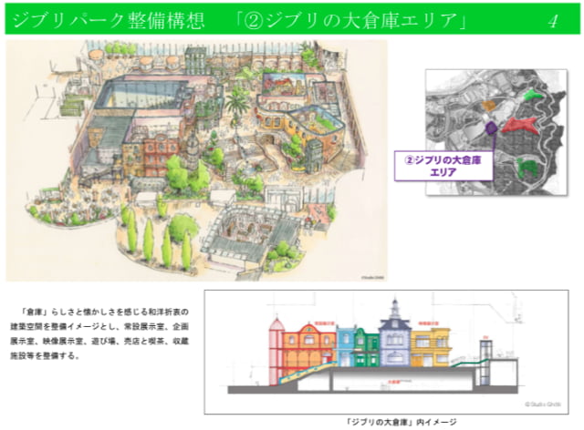 ▼吉卜力大倉庫:這一區域有吉卜力手稿作品展覽館、視聽展覽室、兒童遊樂區、商店和咖啡廳等等。
