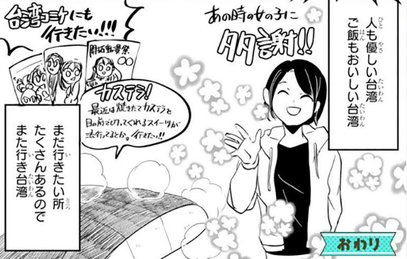 ▼經過這件事,讓九段老師深深體會到了台灣人的熱情,並畫了以上的漫畫表達自己無盡的感激。