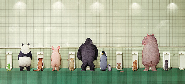 ▼動物們排成一排在小便斗前尿尿,看起來超療癒!