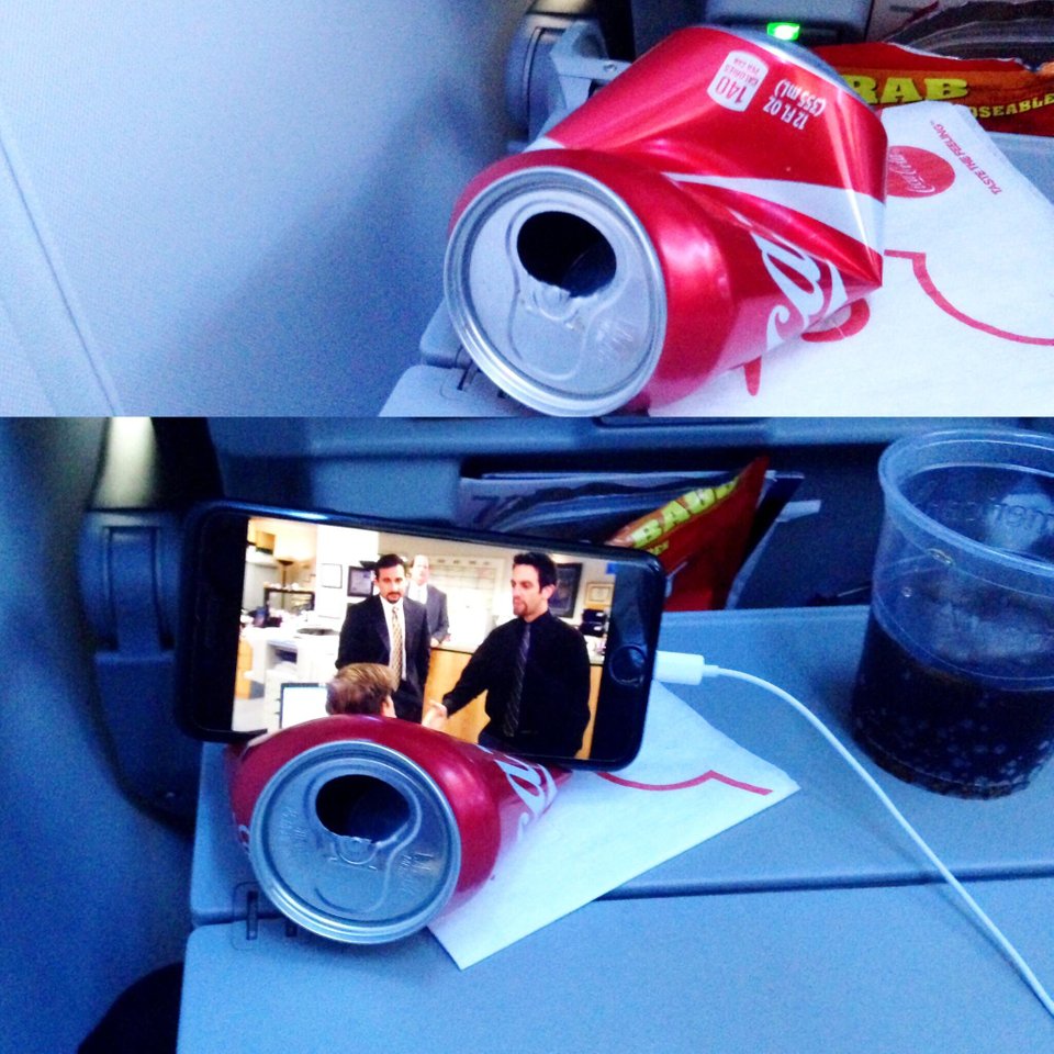 ▼6.在飛機上/車上看影片,沒地方放手機?只要拿瓶喝完的易開罐,壓扁之後就是個簡易手機架了。