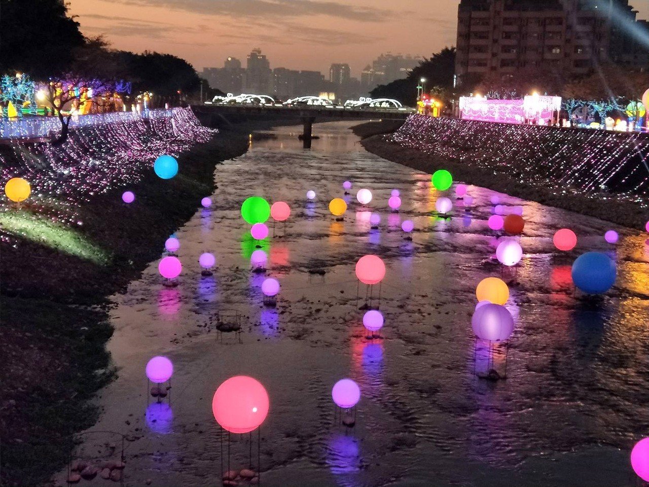 ▼位在三民公園的「三民主燈區」以桃園幸福城為主題,河道上佈滿大大小小的七彩小球,彷彿在宇宙星河間漫遊一樣。還有互動式的燈組,透過人力發電自行車設施讓大樹亮起來!