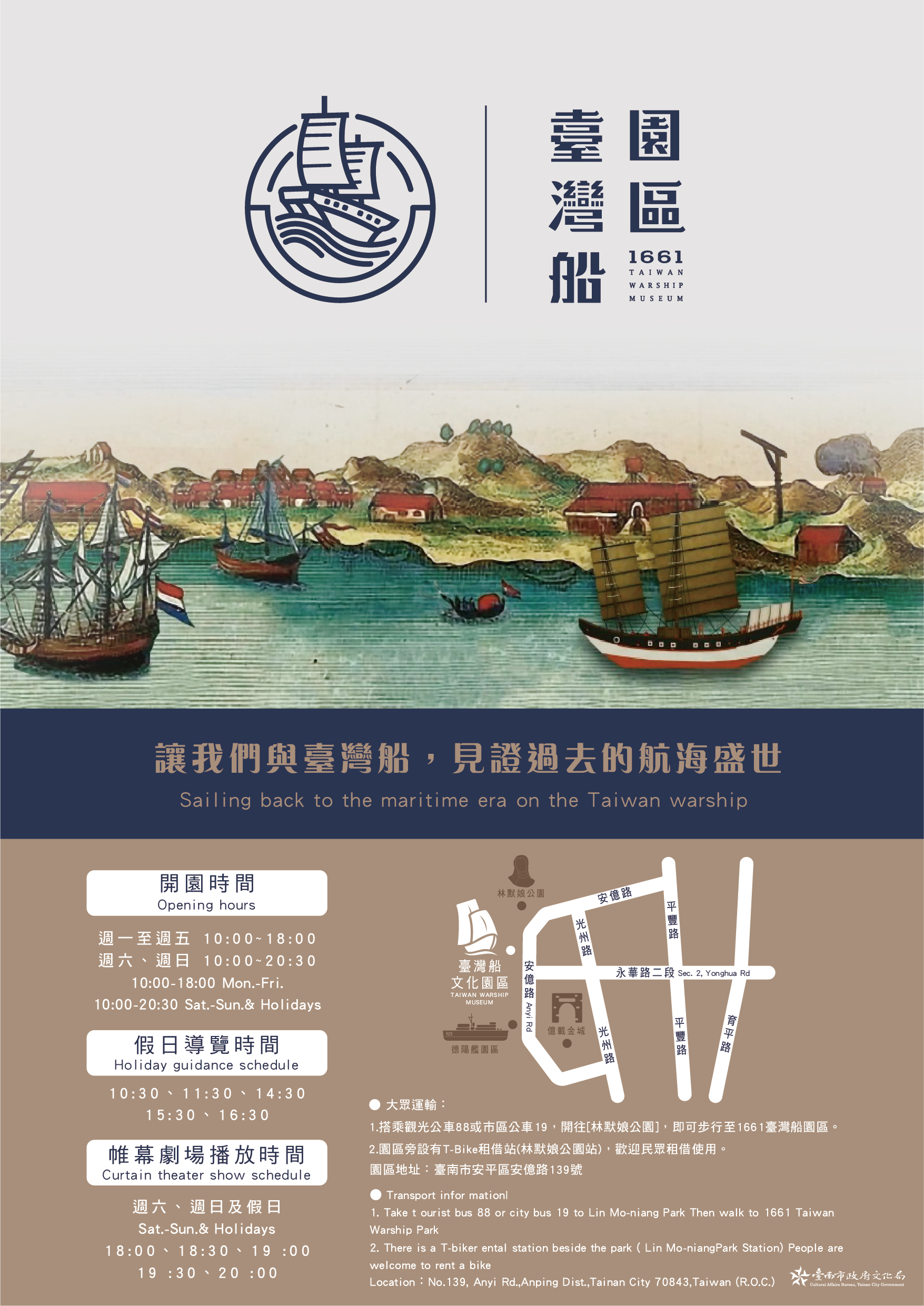 ▼台灣船園區假日參觀提供導覽服務與帷幕劇場播放,地點附近還有許多景點,「林默娘公園」、「德陽艦」、「億載金城」等地點可一路遊訪朝聖。