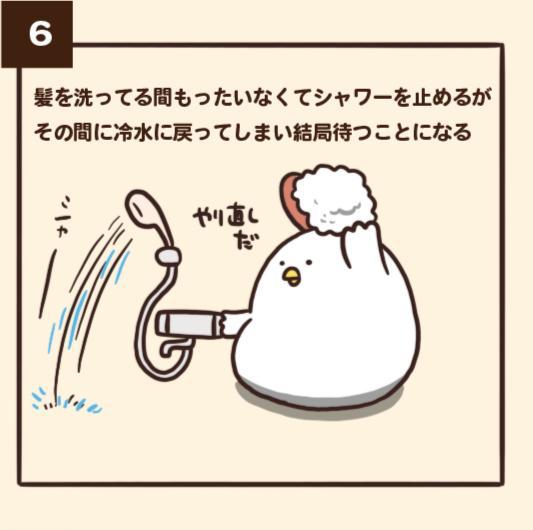 ▼6.「洗頭的時候先把水關掉,結果準備要沖水的時候水冷掉了,又要再等水變熱。」