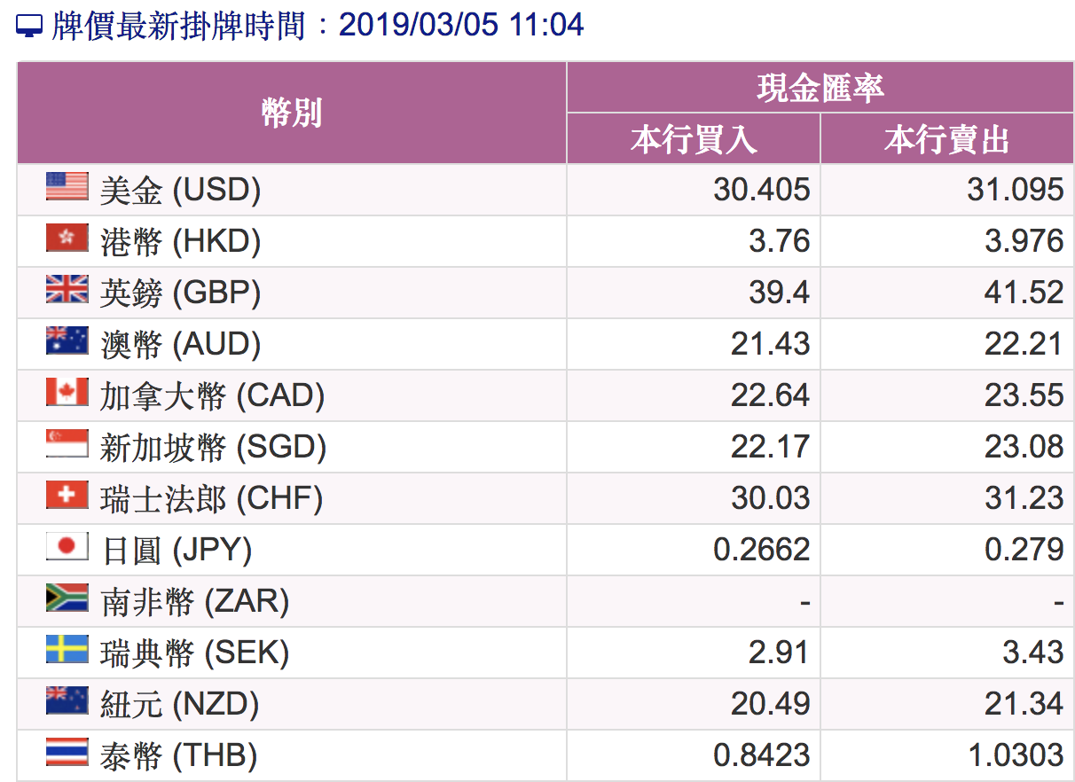 ▼根據台灣銀行最新(2019/03/05 11:04)牌告匯率,日圓成交價已經低於0.28元。