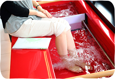 ▼足湯之間以木柵隔開,看起來就像高級的溫泉旅館;每組客人有15分鐘的時間可以泡。