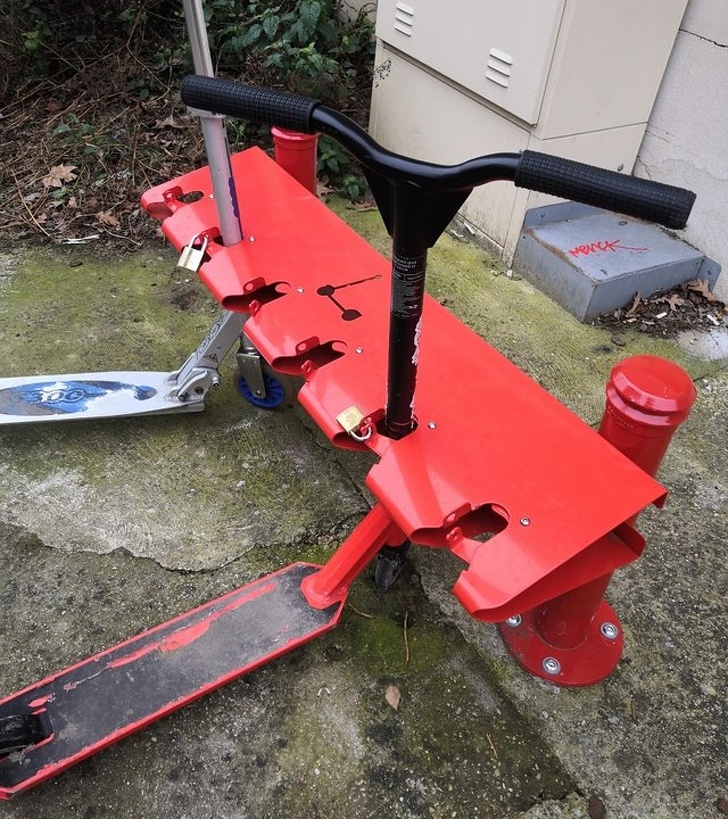 ▼7.小學為小朋友們安裝了滑板車停放區。