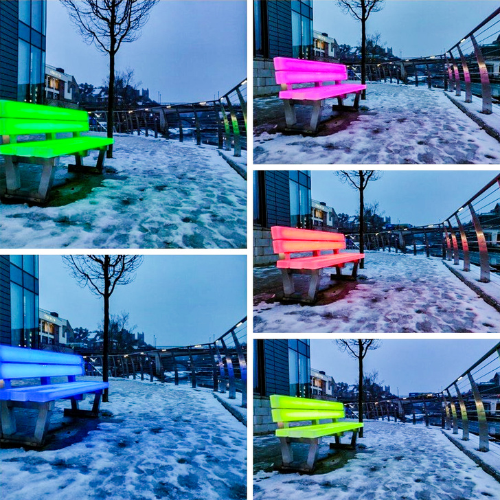 ▼1.會變換燈光的LED燈長凳,為暗夜的城市增添溫暖的氛圍。