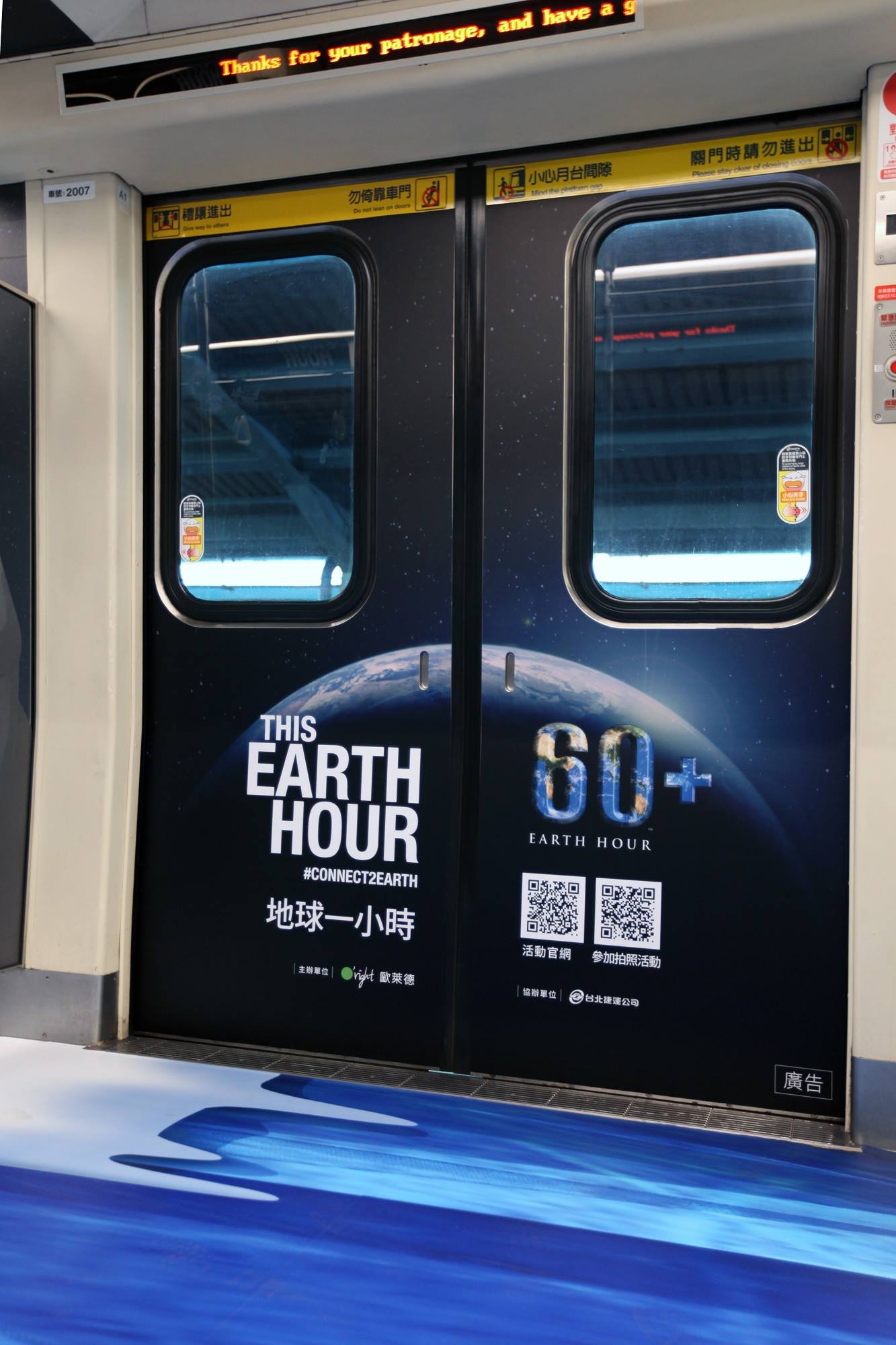 ▼Earth Hour地球一小時活動的亞洲區主辦單位台灣代表O’right歐萊德今日表示,活動初次與北捷合作,打造「地球一小時3D彩繪列車」,以地球暖化為主題,透過3D設計,表達北極熊與其他極地動物的生存正受到地球暖化影響,讓民眾搭乘大眾運輸工具時,可以感受地球暖化所導致的後果,號召大眾一同重視全球危機。