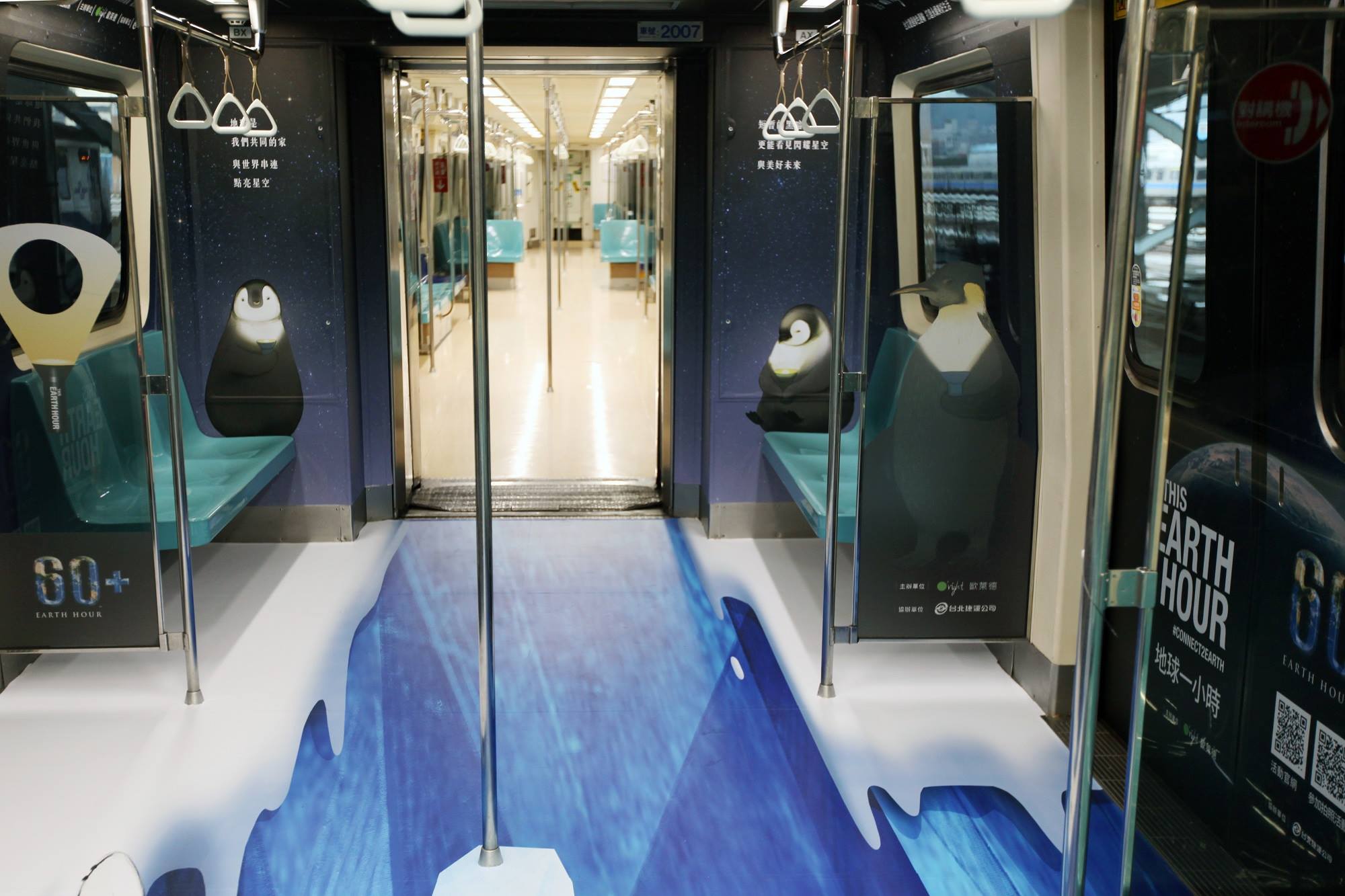 2019年03月13日全球暖化,冰山溶化,許多動物的生存環境開始受到危害、消失,2019「Earth Hour地球一小時活動」將於30日登場,企業與北捷合作,將溶解的冰川搬到捷運車廂裡,透過3D彩繪的方式,讓乘客可以體會地球暖化的危機。