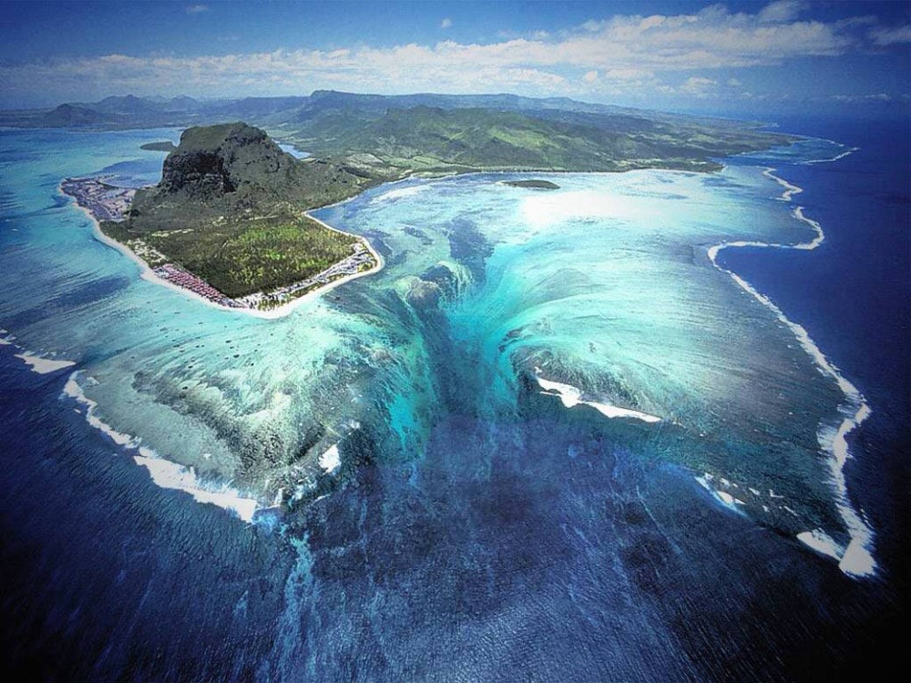 ▼14.模里西斯「海底瀑布」(The Underwater Waterfall):從上方鳥瞰,印度洋上的模里西斯島海中看起來就像有一個大型海底瀑布一樣。不過這其實是海中泥沙所造成的錯視。