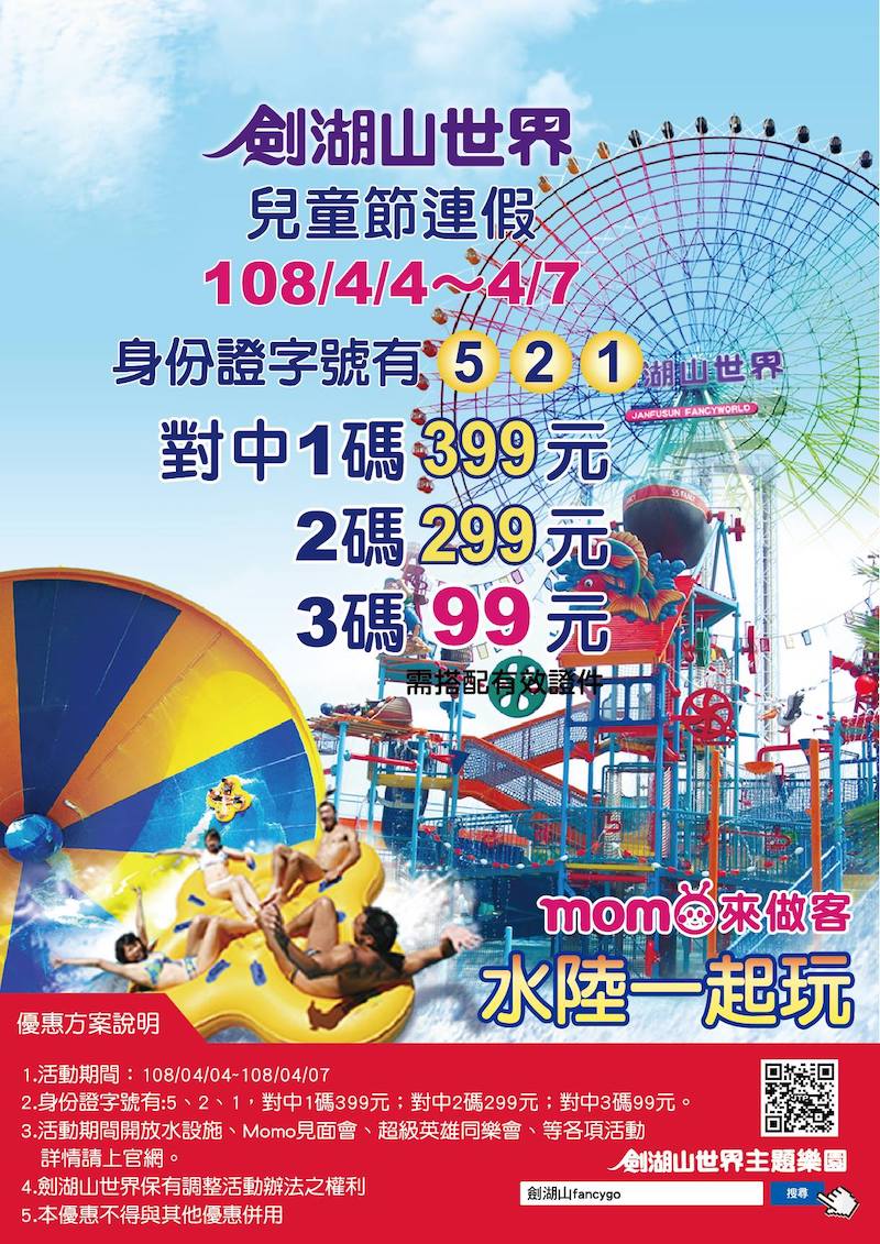 ▼許多主題樂園都在兒童節連假推出對應優惠,劍湖山官方公告指出,只要有「5、2、1」三個數字其中之一,入園票價就折扣為399元,中2碼為299元,3碼全中僅要99元!