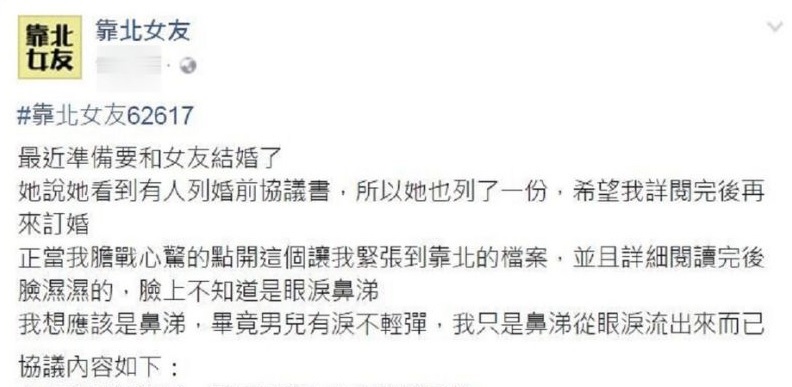▼一名男網友在臉書社團《靠北女友2.0》,分享了一張由未婚妻效仿網友做法、所擬訂的一份「婚前協議書」,並請他過目。原PO膽顫心驚地打開這份文件,卻在詳細閱讀完之後表示:「臉濕濕的,臉上不知道是眼淚?是鼻涕?畢竟男兒有淚不輕彈,我只是鼻涕從眼裡流出來而已…」完全就是一種甜蜜放閃的節奏!