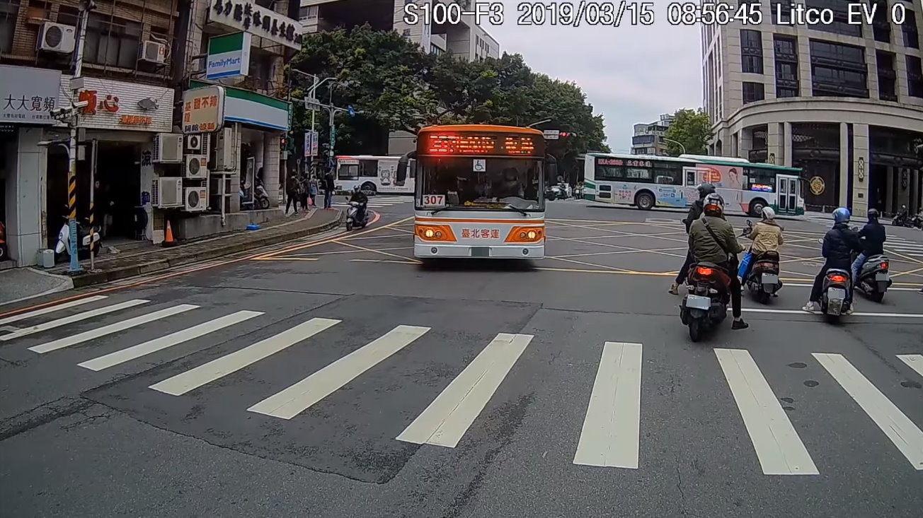 ▼從這段行車紀錄器影片,可以看到一輛首都客運「307路線公車」,它從板橋民族路右轉區運路時,會根據SOP在斑馬線前先停下來,仔細一看可以發現駕駛的右手先比左邊再比右邊。