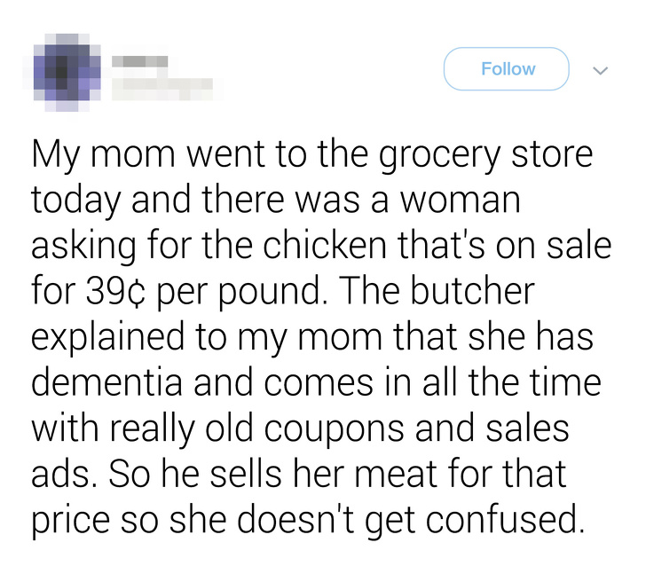 ▼「今天我媽媽到超市時,看到一個女人想要用0.39美元 / 磅 的價格購買雞肉,肉販向我媽媽解釋這個女人有癡呆症,經常拿著很久以前的折價券來買肉,最後他還是以優惠的價錢,將雞肉賣給了這個女人。」