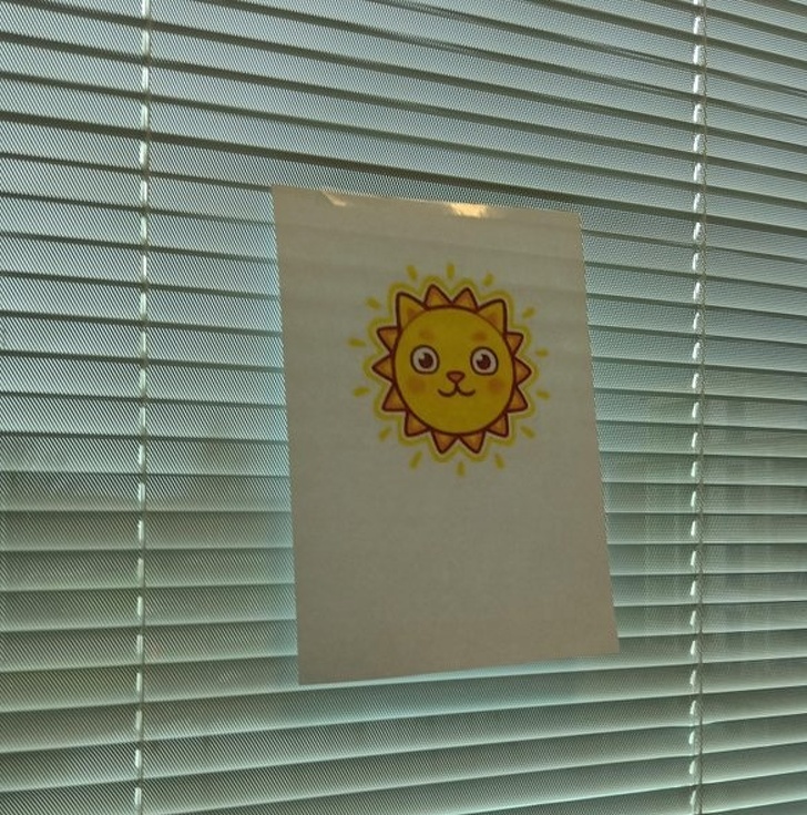▼我的同事注意到我因為陽光的照射而放下了窗簾,當我去喝咖啡回來後,發現了這個「太陽」讓我心情也變好了。