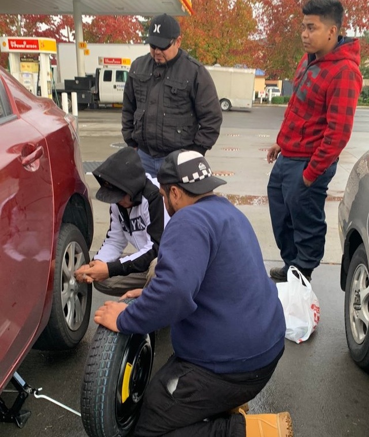 ▼我的車爆胎了,男友在打電話求助時,這群人出現了。他們雖然英語不好卻非常熱心,幫我更換了備胎後,我想給他們一些錢也被拒絕了。