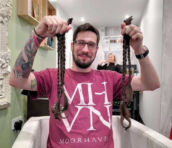 ▼我老公將留了17年的長髮剪掉,並且將它們捐給了慈善機構。