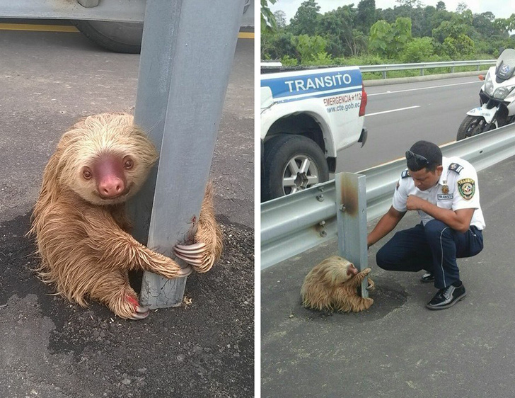 ▼這名警察在高速公路上發現一隻樹懶,他將樹懶送到獸醫處檢查後,再將牠送回森林棲息地。