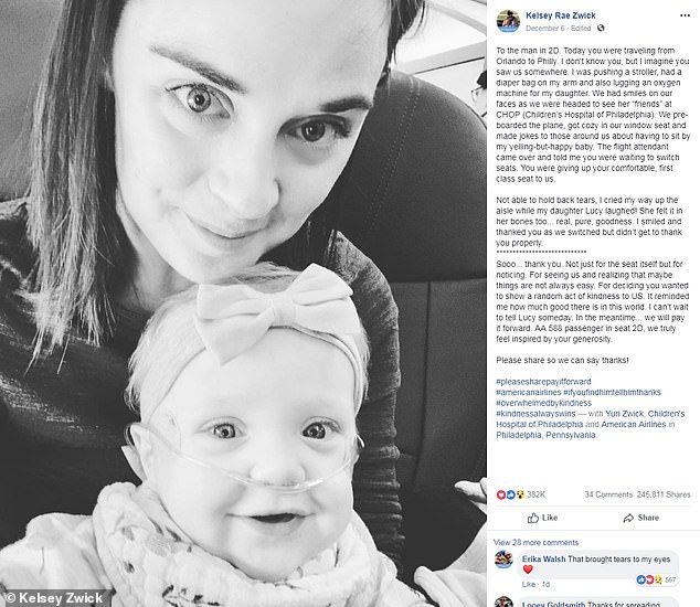▼Kelsey表示:「那位坐在2D的先生,今天我們一起從奧蘭多飛到費城。我們素不相識,但我想,你應該在什麼地方看到了我們。當時我正推著嬰兒車,還拿著尿布、氧氣管。我們準備去費城兒童醫院,看望她的『朋友』。」