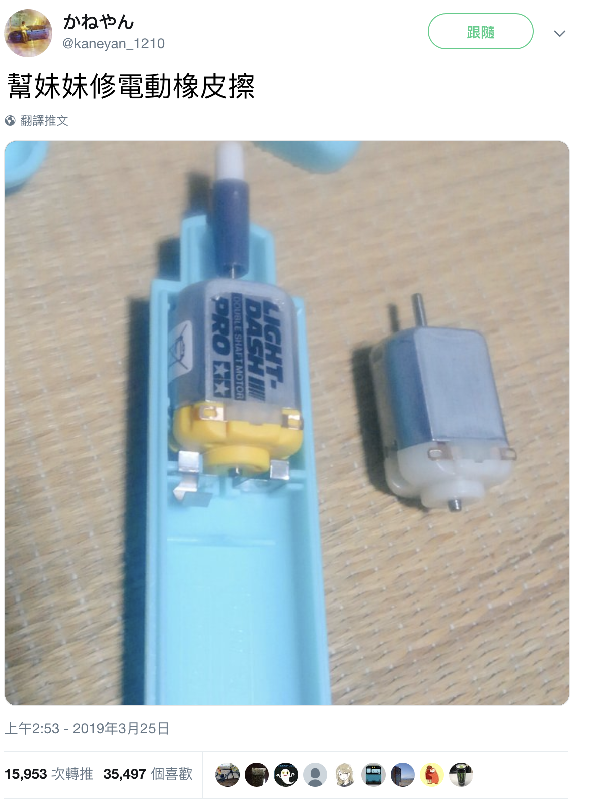 ▼前一陣自有日本網友在推特上發了一篇幫妹妹修電動橡皮擦的推,是馬達壞掉了,只要換一顆馬達就好,但是卻引來超過3萬個網友關注他的馬達…