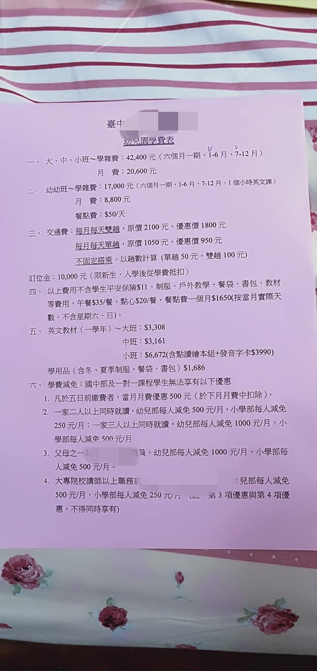 ▼原po也分享了一張貴族幼稚園的價目表,可以看到最貴的小班學生每個學期的學雜費42400元、月費20600元、交通費每月1800元、餐點費每個月1650元,此外還有英文教材6672元、學用品1686元,這樣下來每個學期就必須付超過18.6萬元,讓她忍不住抱怨:「政府只會說一些X話,只會出一張嘴叫人快點增產報國,請問你們配套措施有很完善嗎?」