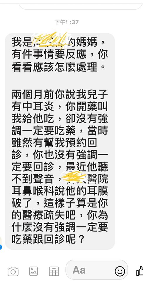 ▼家長在私訊中指出「兩個月前你說兒子有中耳炎,開藥叫我給他吃,卻沒有強調一定要吃藥,當時雖然有幫我預約回診,你也沒有強調一定要回診,最近他聽不到聲音,醫院耳鼻喉科說他耳膜破了,這樣算是你的醫療疏失吧,你為什麼沒有強調一定要吃藥跟回診呢?」