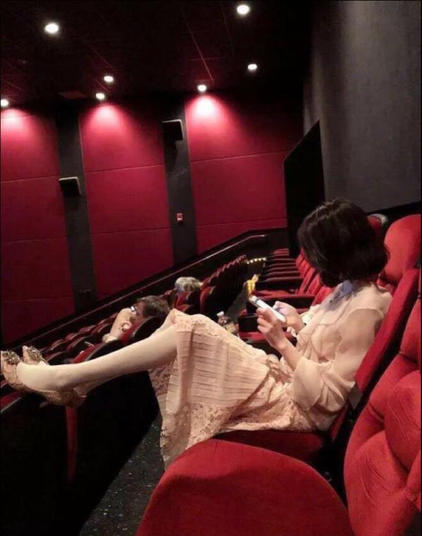 ▼可以看到照片中有兩位女生,在電影院內分別將腳跨到前方座位的椅背上,邊舒服的玩手機。