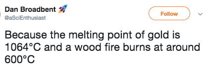 ▼「因為金的熔點是1064度啊!柴火只有600度左右!」