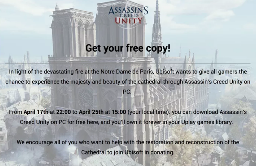 巴黎聖母院遭遇大火後,世界各地都紛紛有人要幫助重建。之前引起網友熱烈討論的《刺客教條:大革命》(Assassin’s Creed Unity),遊戲公司Ubisoft也表達了對網友的感謝,以及全力支持重建巴黎聖母院的計畫!