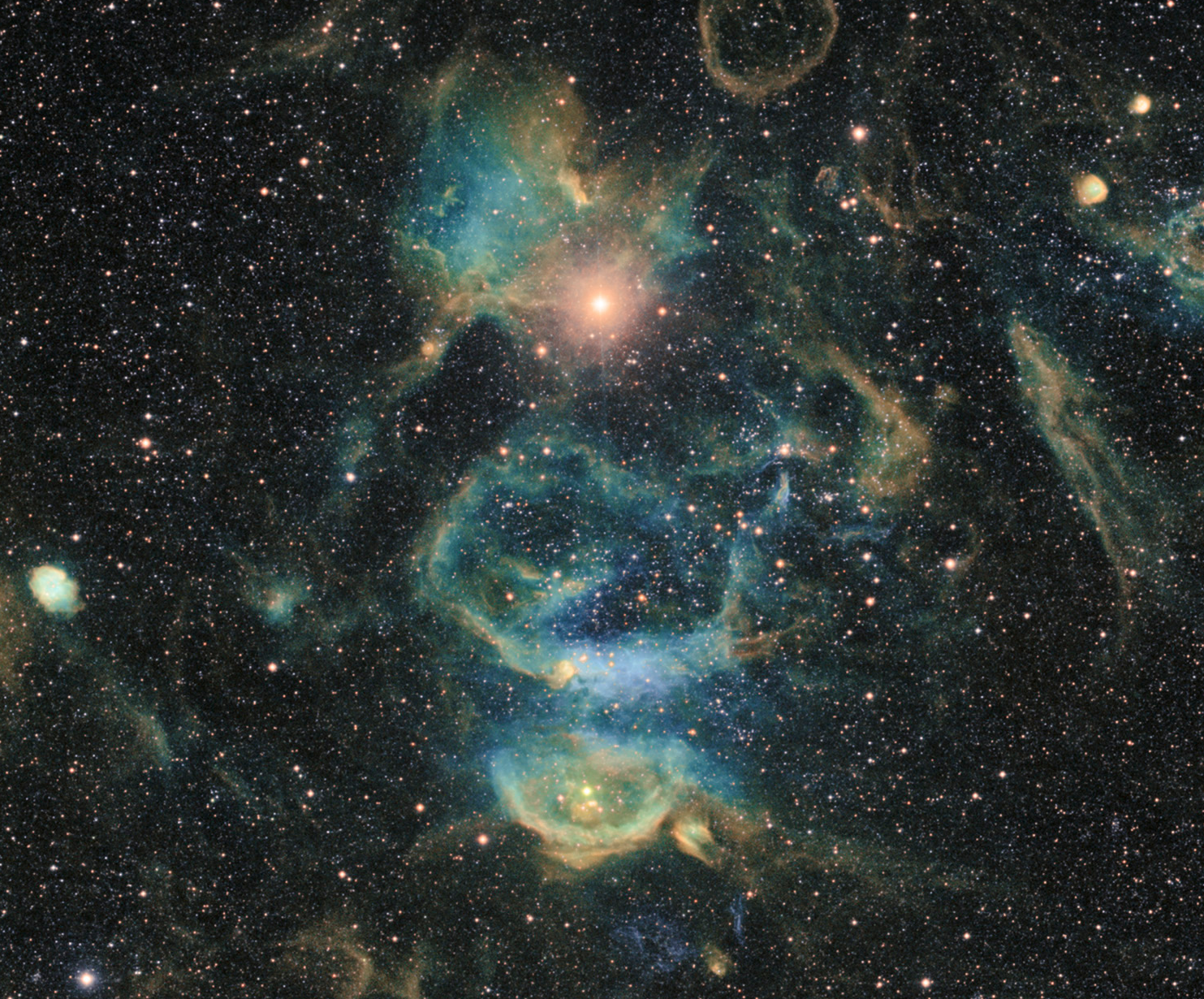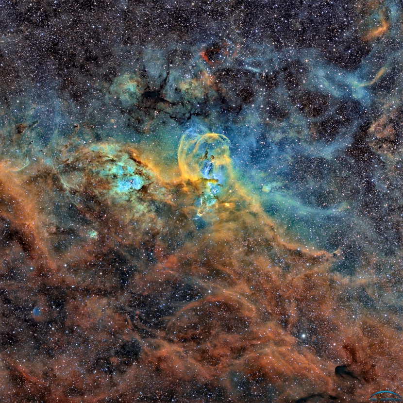 ▼他們也有使用特別的濾鏡,讓可見光譜的窄波段(656nm 的 Hydrogen Alpha、672nm 的 Sulfur、500nm 的 Oxygen III)穿過,令星雲中的化學成分更顯眼。下面這張是另一個版本的大麥哲倫星雲照片。