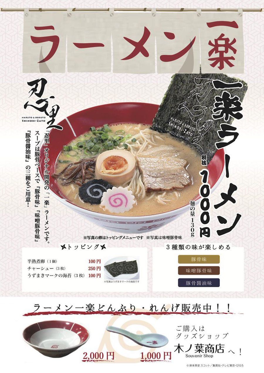 ▼在主題樂園的其他設施方面,也有著鳴人最愛吃了一樂拉麵,有豚骨、味增豚骨和醬油豚骨三種口味,每碗未稅價是日幣1000元(約台幣275元)。
