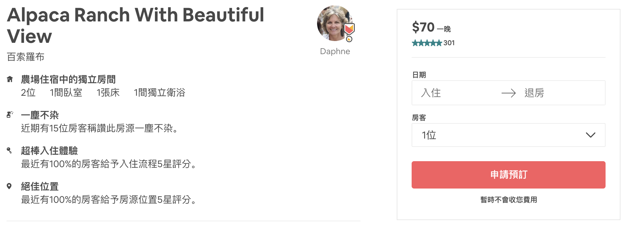▼民宿主人「達芙妮(Daphne)」在Airbnb上寫下,他是一位退休的空服員,因為超愛紡紗、針織跟草泥馬,所以退休後開始經營草泥馬農場。