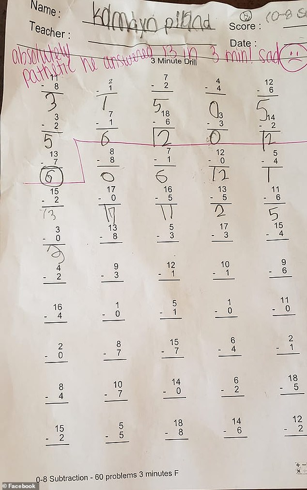 ▼Chris的兒子剛上二年級,大概7、8歲。那天兒子拿回一張數學考卷,老師要求學生在3分鐘內解答儘量多的題目。50道題中兒子只答了13道。老師用紅筆評價說:「太差勁了!他3分鐘裡只答了13道題。真悲哀。」最後還畫了一個失望的表情。
