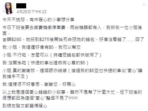▼根據原po的文章表示,當天她下班要繳付停車費時,碰巧兩台機器都有人在使用,於是她排在一位小姐的後面,發現前方小姐要繳付的金額為280元,但對方只付了275元就開始拼命挖錢包,看來是沒零錢了。