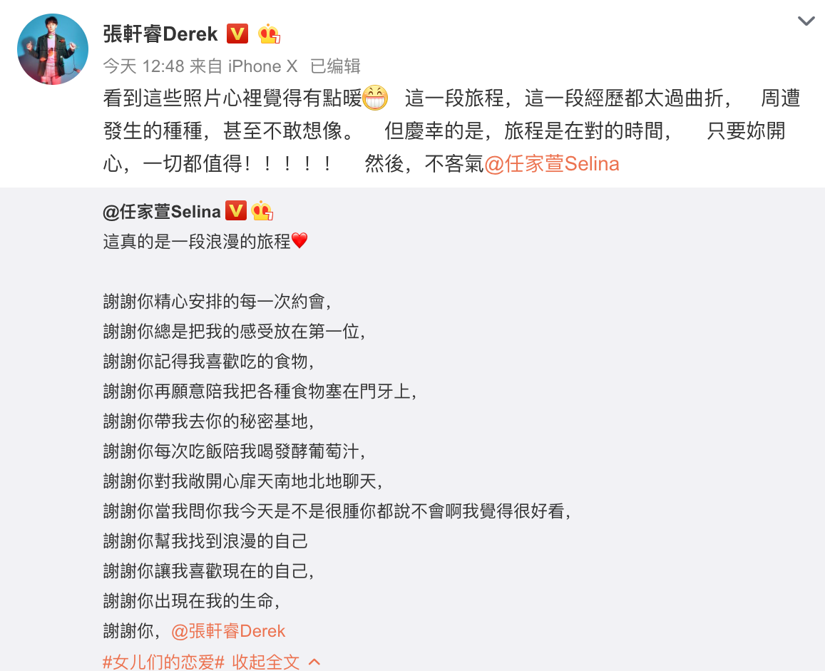 ▼在節目播出後,Selina 還在微博發文表示「謝謝你出現在我的生命中」,即使之前是節目效果,也算是非常有誠意!