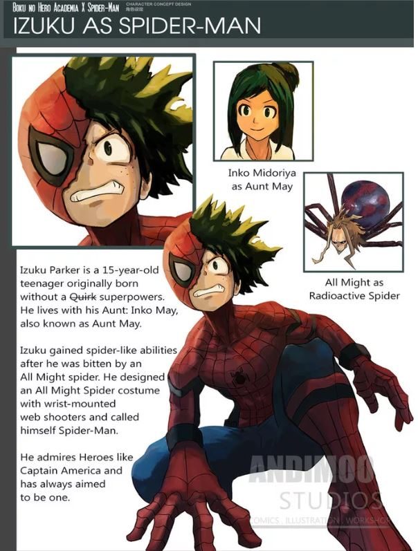 綠谷出久原本沒有任何的超能力,與嬸嬸「梅嬸」住在一起。自從他被一隻蜘蛛咬到後,獲得了蜘蛛般的能力,於是他開始設計屬於自己的蜘蛛裝。同時他也非常崇拜美國隊長那些超級英雄,夢想自己有天也能成為他們的一份子。