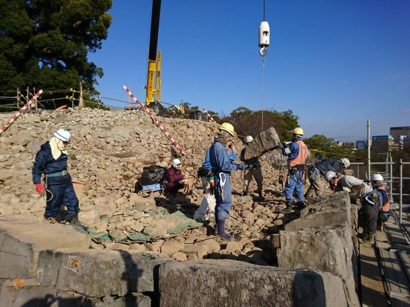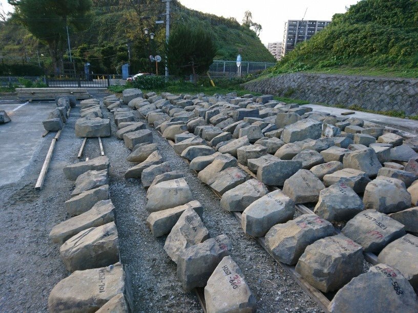 ▼日本匠人修復熊本城的力量不可小覷,首先,他們把墜落的石塊紛紛按照位置排列、編號,再一一按照號碼放回原本的位置,務必要求一磚一瓦都回歸原位。