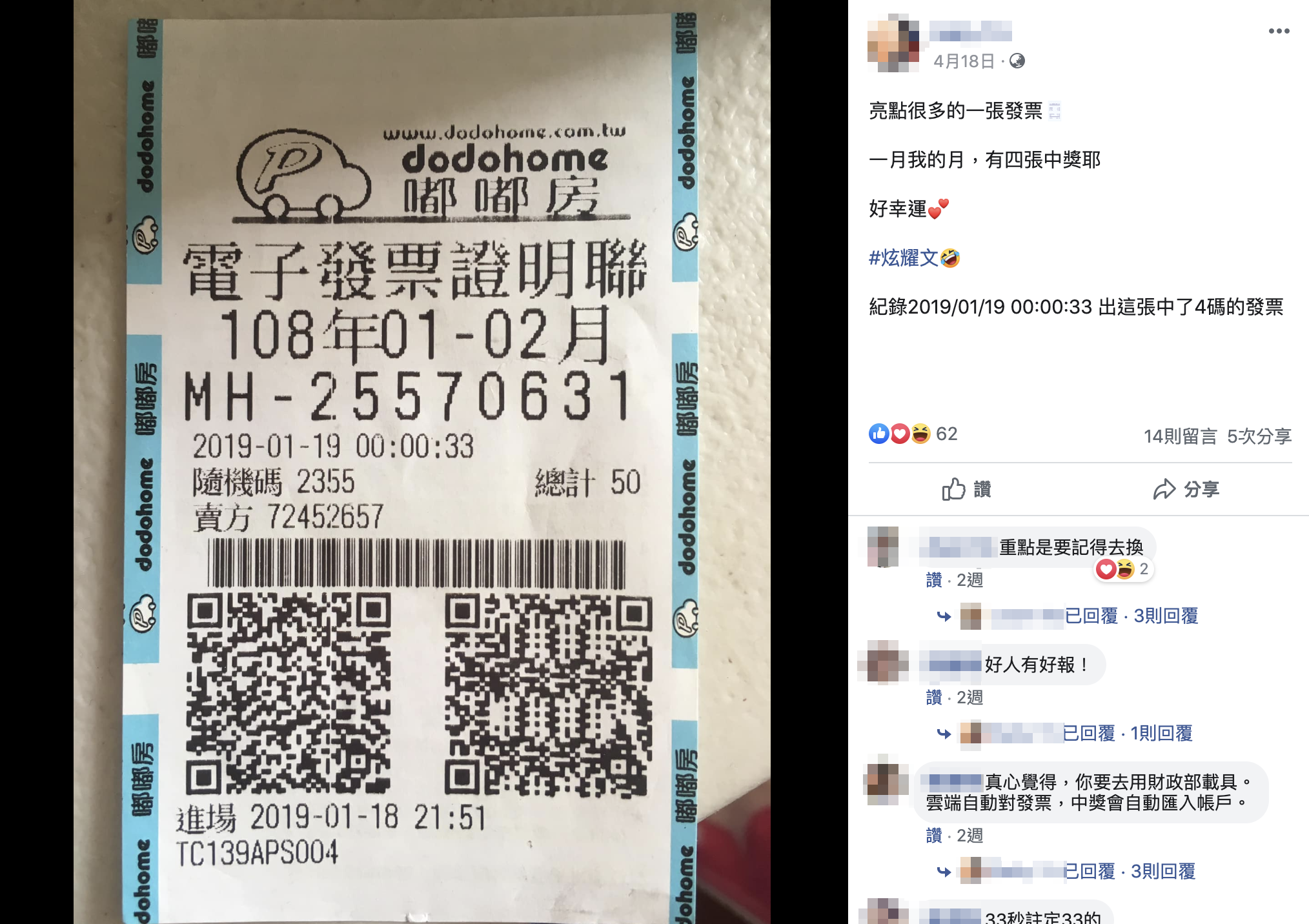 ▼網友在4月18日在Facebook上貼出一張1月的中獎發票,開心地炫耀自己發票中了5獎,獎金1,000元,而且這張中獎發票的消費日期剛好是該名網友的生日,讓她開心直呼「亮點很多的一張發票」。