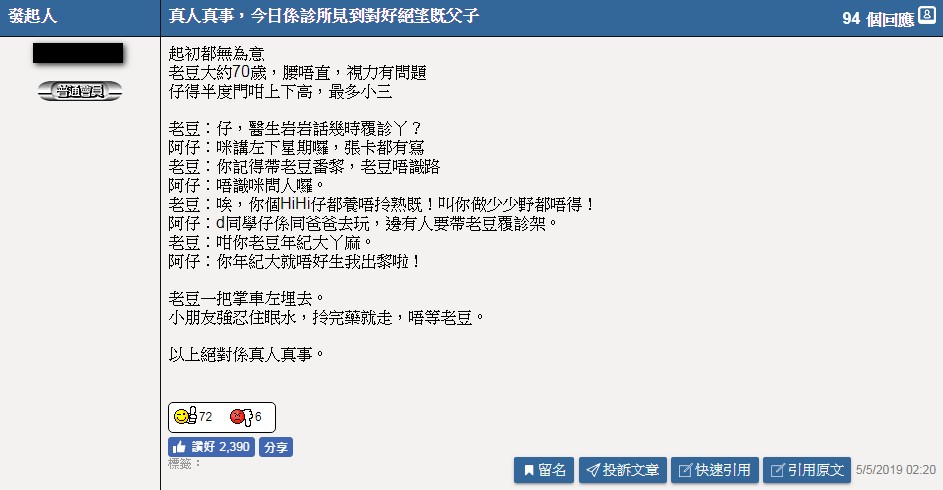 2019年05月10日雖然在許多人的觀念當中,老來得子是一件非常值得高興的事,可是事實上是否真的如此?一名香港網友在「高登論壇」上發文表示,自己近日在診所親眼目睹一對年紀差距超大的父子,兩人的相處互動令無數網友都陷入了沉思當中。