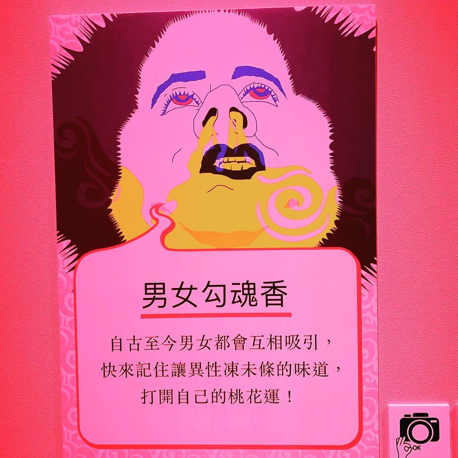 ▼在展覽一開始的位置拜放各式各樣的傳統日本茶氣味,讓人感到舒適典雅芳香氣味。下一個單元移到「男女勾魂香」,能夠吸引異性的費洛蒙香水,展覽的前部分都還算是舒服的氣味,到後面口味就越來越重了!