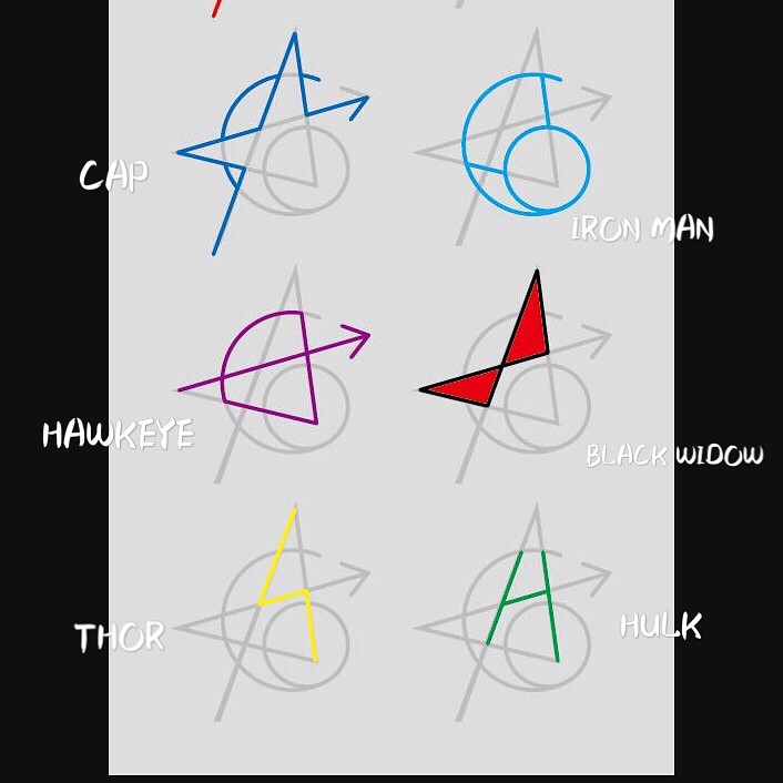 ▼這個圖案每一部分都代表著一位超級英雄,比如鋼鐵人的電弧反應器「圓」、美國隊長的「星星」、鷹眼的「箭」,索爾的「閃電」,還有黑寡婦的個人符號。
