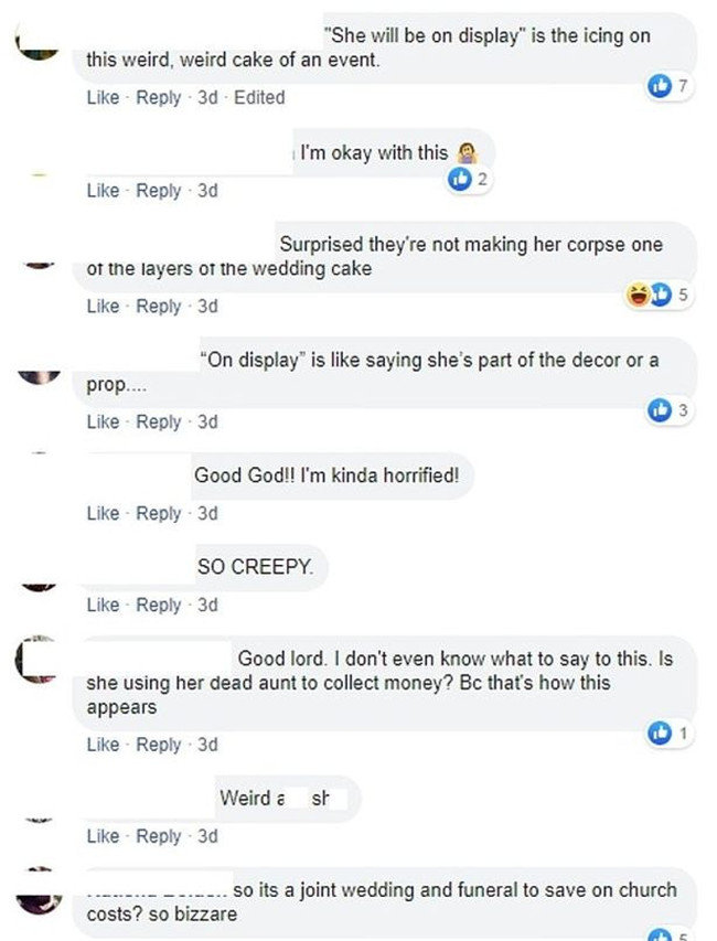 ▼接下里的一段話更讓大家震驚,她表示因為舉辦喪禮的成本暴漲,所以將在婚禮中舉辦開棺瞻仰遺容的環節,「請隨意在婚禮中停下來跟姨媽告別,即使失去所愛的人叫人心碎,但也希望新人的愛情和婚禮的祝福能帶給大家快樂,很期待在星期六見到你們。」