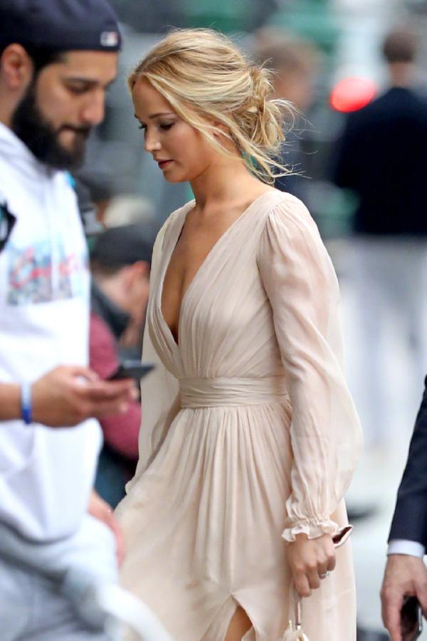 ▼珍妮佛勞倫斯訂婚當天的穿搭非常亮眼,這件設計簡單的洋裝完美襯托了她的好身材。其實她出席電影《Faces Places》的首映禮時,就曾穿L. Wells的洋裝。V領設計搭配輕盈的蕾絲,展現出優雅的女神氣息。